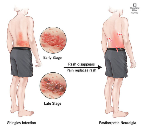 Postherpetic neuralgia (PHN) results from damage to nerve fibers during shingles infection. The nerve fibers at the skin in the affected area send exaggerated pain signals to your brain. Postherpetic neuralgia means nerve pain after herpes. Shingles is also called herpes zoster.